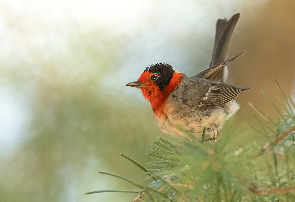 Specialties of Arizona’s southern sky islands include the Rufous-capped Warbler (Basileuterus rufifrons), an uncommon but now established breeder in canyons of the Huachuca and Santa Rita Mountains, and the spectacular Painted Redstart (Myioborus pictus), which nests along shaded montane streams and often fans its tail while foraging. The Olive Warbler (Peucedramus taeniatus), though no longer classified within Parulidae, is a characteristic member of Arizona’s high-elevation pine forests, while the Yellow-breasted Chat (Icteria virens), likewise now placed in its own family Icteriidae, remains a familiar summer resident of dense riparian thickets. Collectively, these species—ranging from desert-adapted Lucy’s Warblers to canopy-dwelling Grace’s and conifer-loving Olive Warblers—reflect Arizona’s extraordinary ecological range, making spring and fall migration periods some of the most vibrant birding seasons in North America.