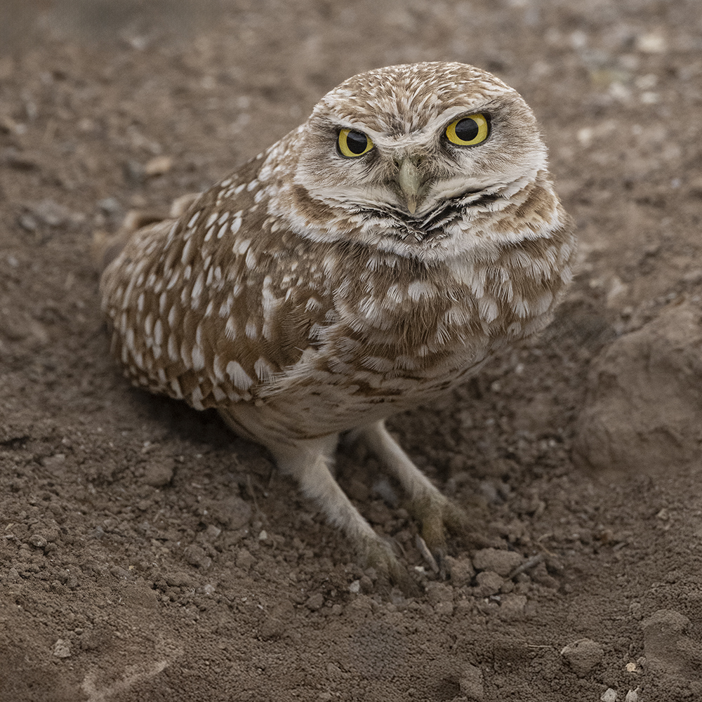 The Burrowing Owl is a small, long-legged owl found year-round in parts of Arizona, favoring open grasslands, deserts, agricultural fields, and prairies with low vegetation. Unlike most owls, it nests and roosts in underground burrows, often those abandoned by mammals such as prairie dogs or ground squirrels, though it may also use artificial burrows. In Arizona, populations occur both in natural desert habitats and in human-modified landscapes, including farmlands, golf courses, and even urban edges. Standing about 7.5–10 inches tall, with bright yellow eyes, white eyebrows, and mottled brown and white plumage, the species is diurnal as well as crepuscular, often seen perched near burrow entrances or hunting insects, small mammals, reptiles, and other prey in daylight. Breeding typically begins in spring, with clutches of 6–12 eggs laid in burrows lined with dried vegetation, feathers, and sometimes animal dung, which may help mask scent from predators. While the species is globally listed as Least Concern, Burrowing Owls in Arizona face threats from habitat loss, agricultural intensification, and the decline of burrowing mammals, leading to local population declines and increased conservation attention, including artificial burrow programs and habitat protection efforts.