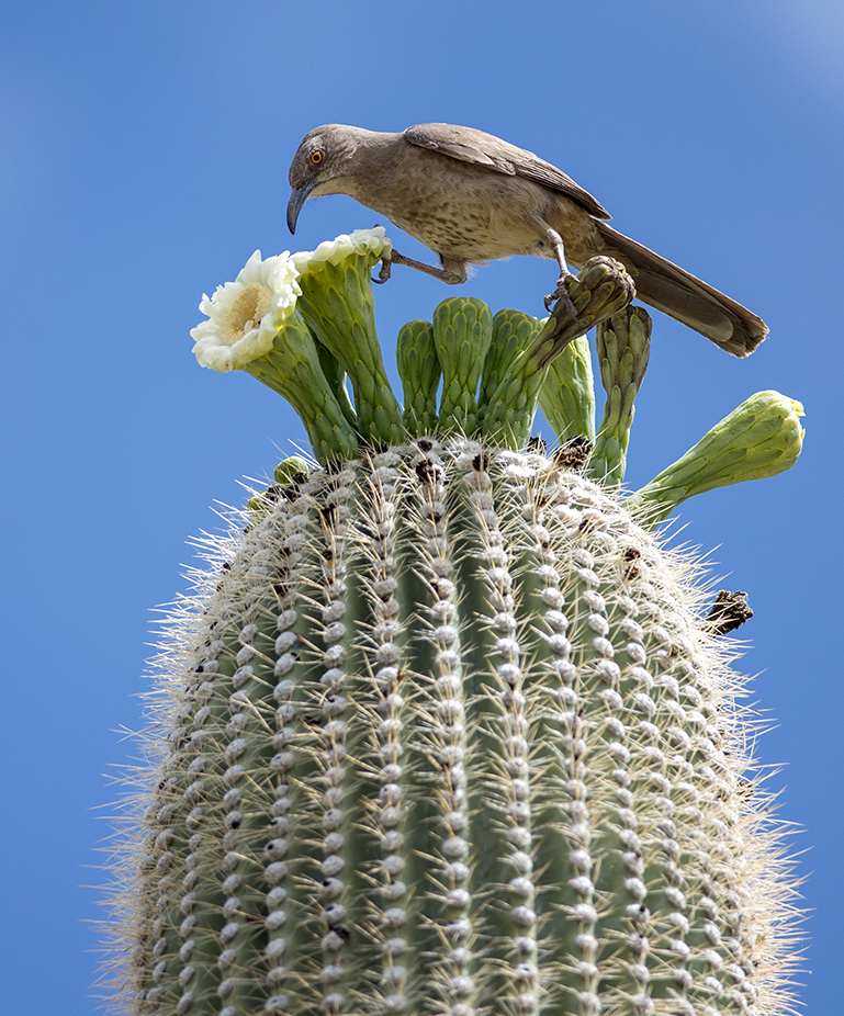 As its name indicates, you can easily identify this common desert bird by its downward curved bill. The eye is orange-yellow and the body is grayish brown above, paler off-white below mottled with gray-brown speckling. Pairs mate for life and maintain their territory, about 5-10 acres, year-round. These thrashers have a distinctive whistled whit-wheet call.