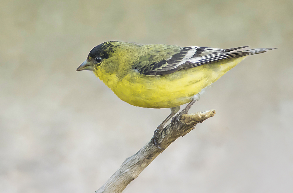 The Lesser Goldfinch is one of the most widespread and familiar finches in Arizona, particularly common in the southern and central parts of the state. This small, lively songbird is easily recognized by the males’ glossy black cap, greenish back, and bright yellow underparts, although their plumage can vary regionally in the depth of green and yellow tones. Females and immatures are more subdued in color, with olive backs and duller yellow underparts, making them less conspicuous.
