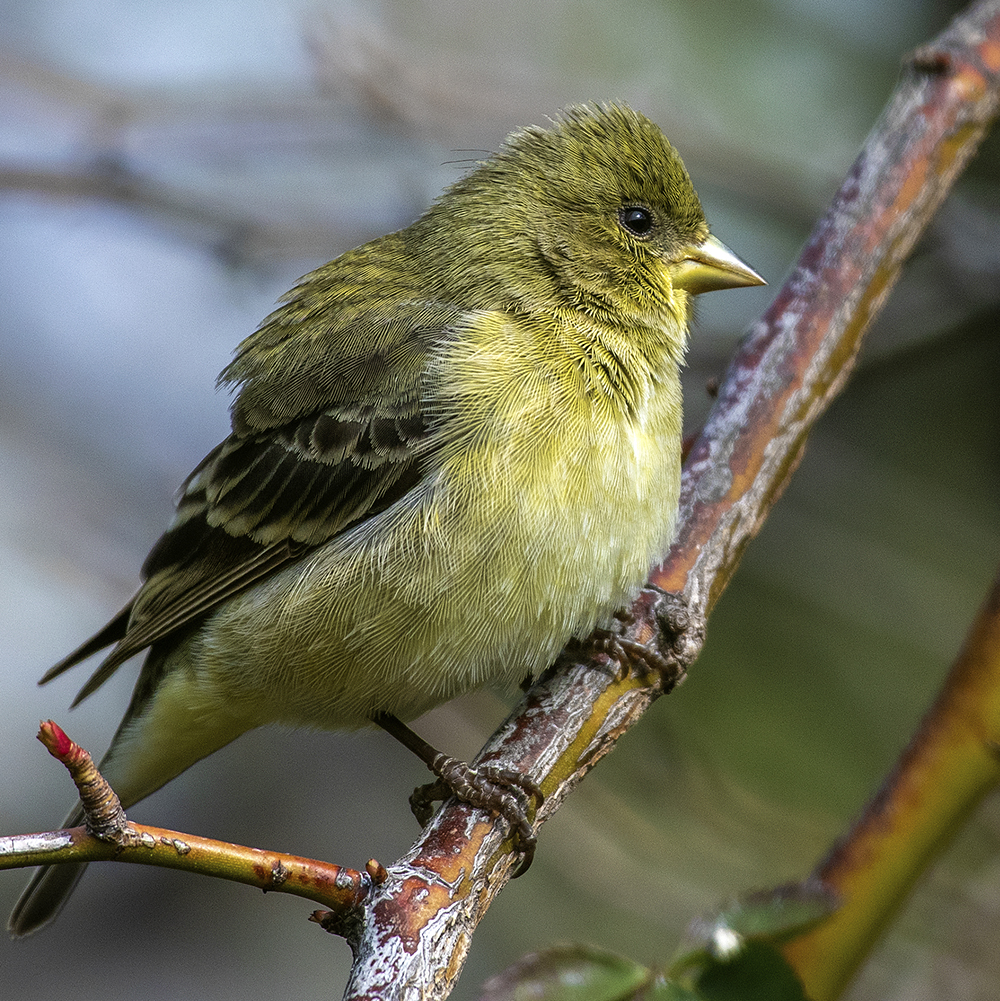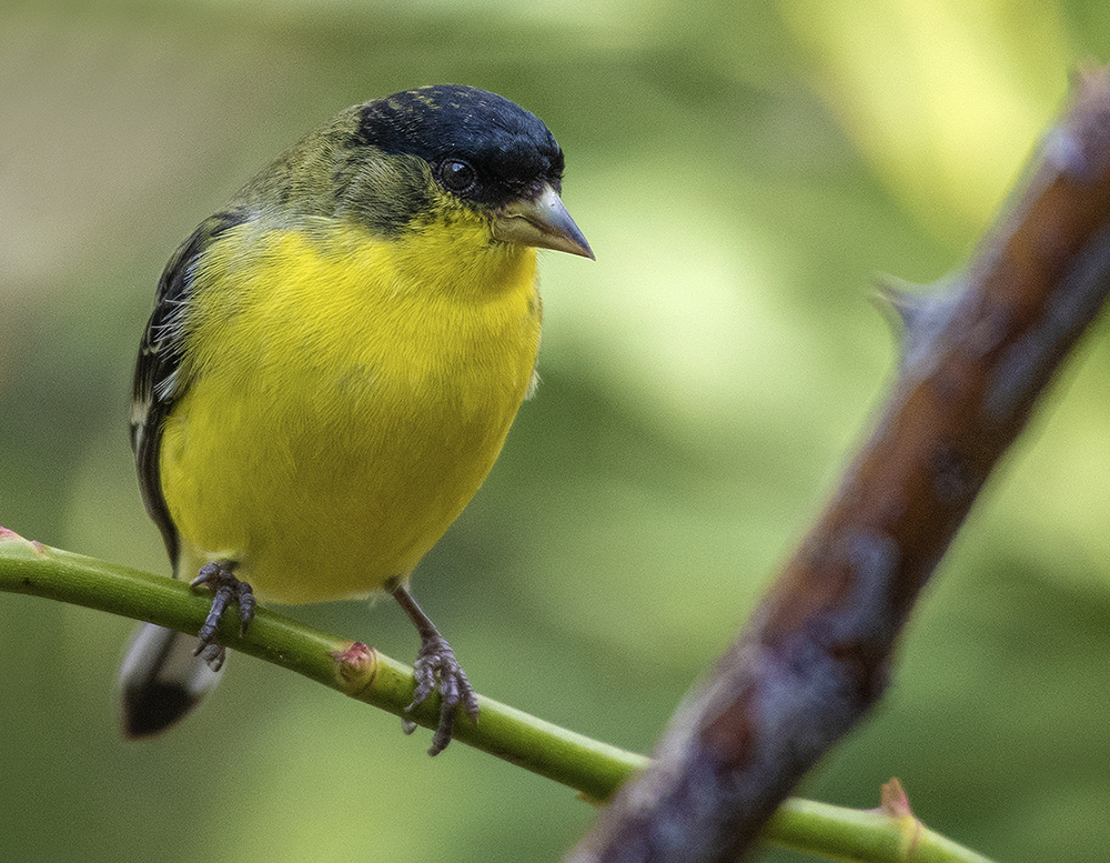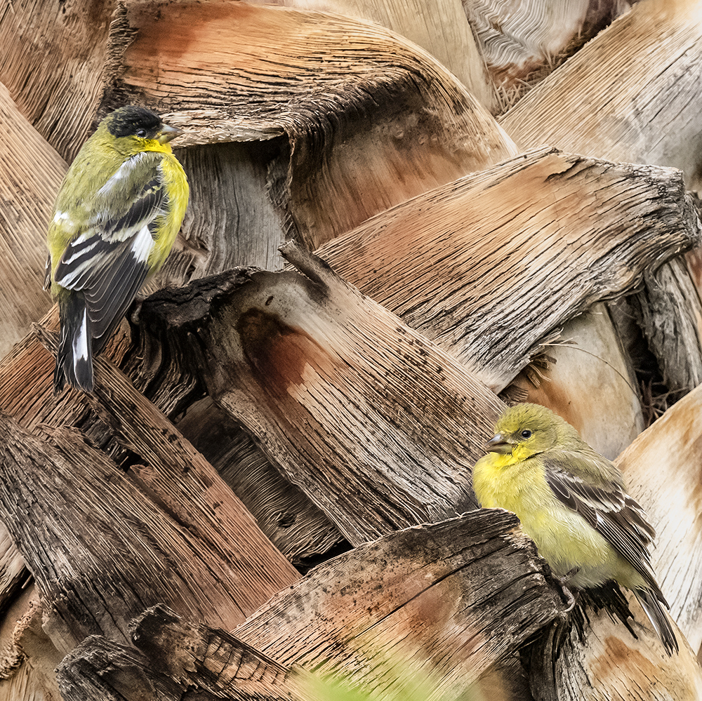 They thrive in a wide range of habitats in Arizona, including desert scrub, riparian corridors, foothills, suburban gardens, and urban parks, often forming large flocks outside of the breeding season. Lesser Goldfinches are especially fond of thistle and sunflower seeds, and they frequently visit backyard feeders stocked with nyjer or black oil sunflower seeds. They have thin, wheezy songs, often delivered in flight.