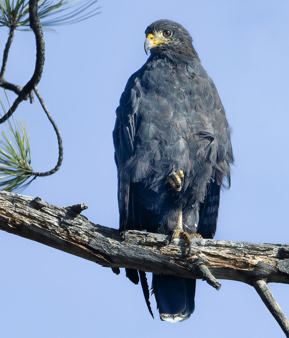 The Common Black Hawk is an uncommon but regular summer breeding raptor in Arizona, primarily found along riparian corridors in the southeastern part of the state, especially in cottonwood–willow-lined rivers and streams. Slightly larger than a Red-shouldered Hawk, it has broad wings, a short tail with a bold white band, and dark plumage that appears almost black in good light. These hawks feed mainly on crayfish, frogs, and other small aquatic prey, often hunting from low perches over water. In Arizona, they typically arrive in March or April to nest and depart by late summer or early fall, with a few lingering into October. Their nests, large stick structures often placed high in cottonwoods, are usually reused year after year. Although their North American range is limited, Arizona supports a significant portion of the U.S. breeding population, making them a sought-after species for birders in the state.