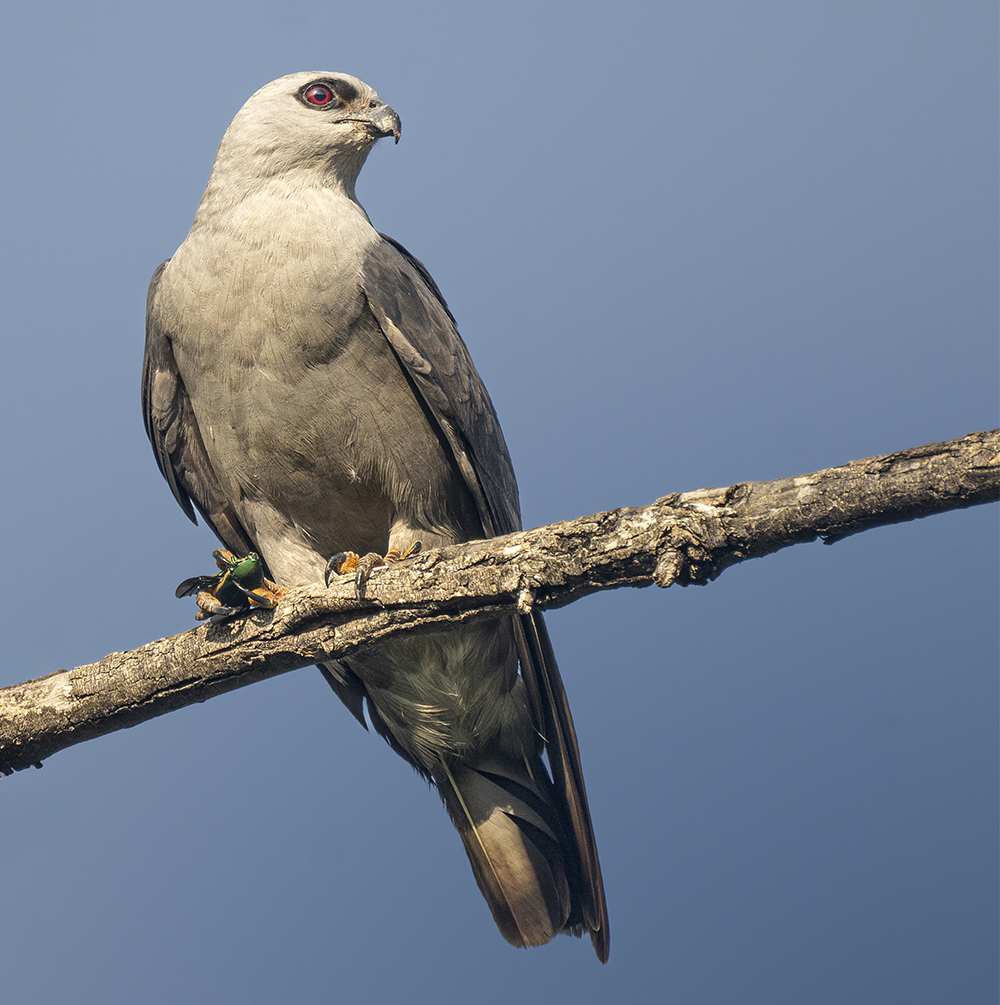 The Mississippi Kite is a slender, graceful raptor that is a rare but regular summer visitor to Arizona, primarily in the southeastern part of the state. Adults are pale gray with darker wingtips and a long, pointed tail, while juveniles are streaked brown above and heavily streaked below. These kites are adept aerial hunters, catching insects such as dragonflies and cicadas in flight, and they often perform buoyant, acrobatic glides over open areas. In Arizona, they are typically found in riparian corridors, agricultural lands, and open woodlands during their breeding season, with scattered nesting records in places like the San Pedro River Valley. Most individuals arrive in late spring, with numbers peaking in summer before migrating south to wintering grounds in South America.