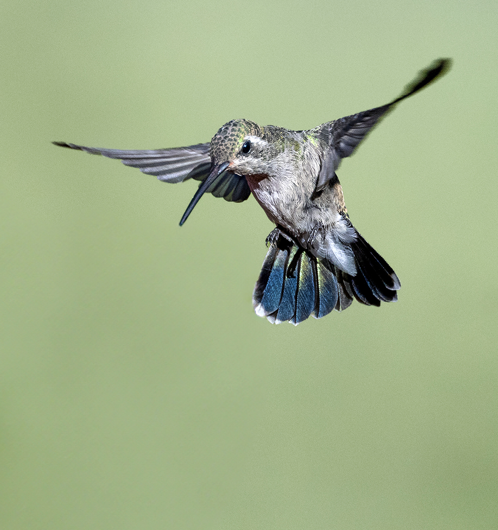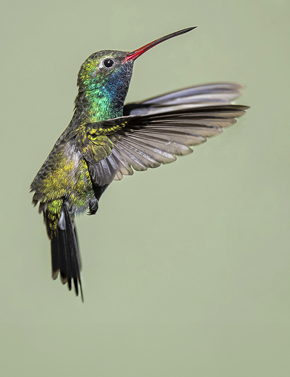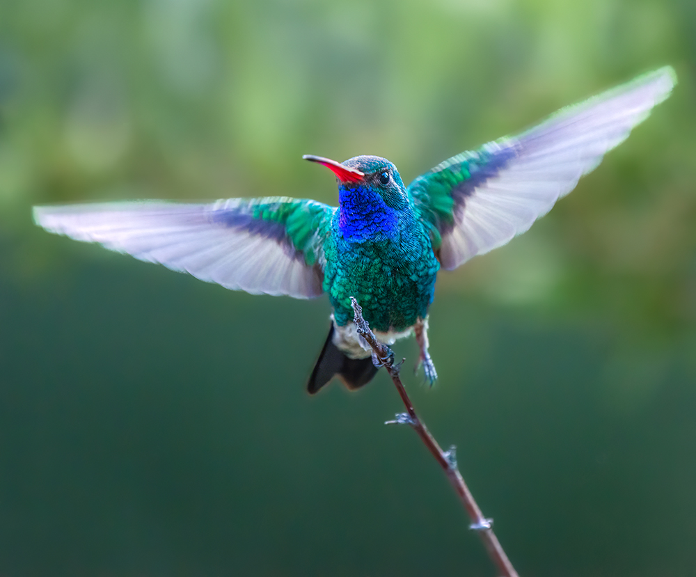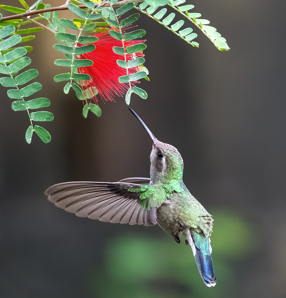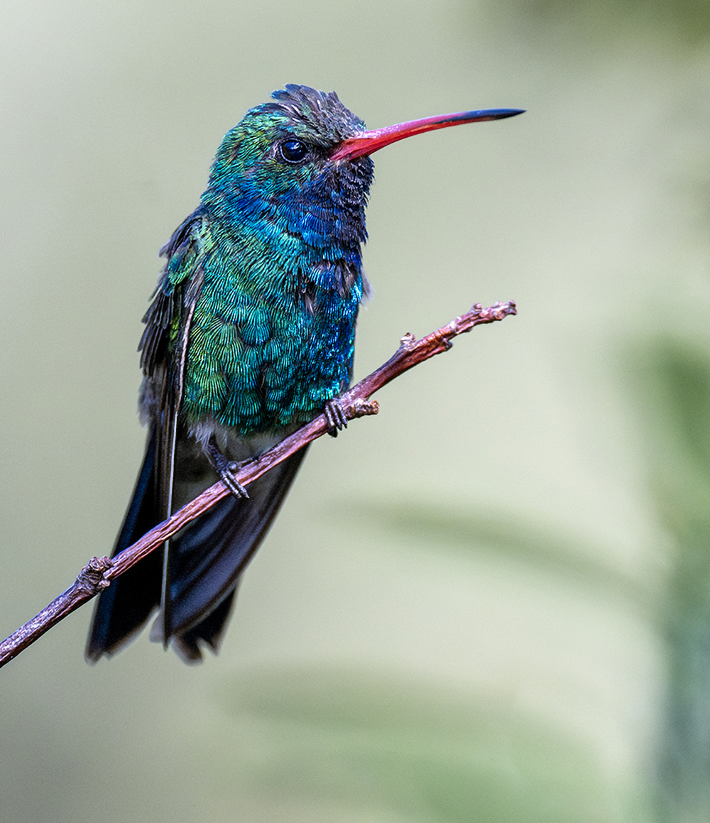 Broad-billed Hummingbird is a summer-breeding visitor in southeastern Arizona, most abundant along riparian corridors and canyon bottoms—places like Madera Canyon, Sonoita Creek, and the Santa Cruz River—where it occurs from roughly March through September. The male’s vivid emerald-green body, glittering sapphire-blue throat, and broad red bill with a black tip make it unmistakable; females and juveniles are paler, with whitish underparts and variable throat spotting. This species feeds on nectar from native flowers (e.g., desert honeysuckle, Penstemon) and backyard feeders, then migrates south into Mexico for the winter, although with a plentiful source of nectar, some stay all year round.