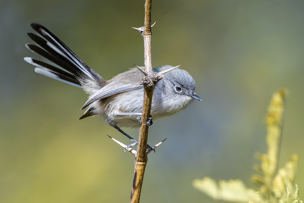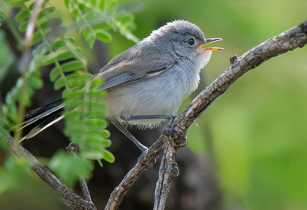 The Blue-gray Gnatcatcher is a small, active songbird widely distributed across Arizona, especially during the breeding season. Recognizable by its bluish-gray upperparts, white underparts, and long black-and-white tail, this species is often seen flitting about in search of insects. In Arizona, it breeds in riparian woodlands, oak–juniper foothills, and desert washes with mesquite (Prosopis spp.), cottonwood (Populus fremontii), sycamore (Platanus wrightii), and oak (Quercus spp.) cover. It constructs a compact, lichen-covered cup nest in trees or shrubs, where the female lays 3–5 eggs.