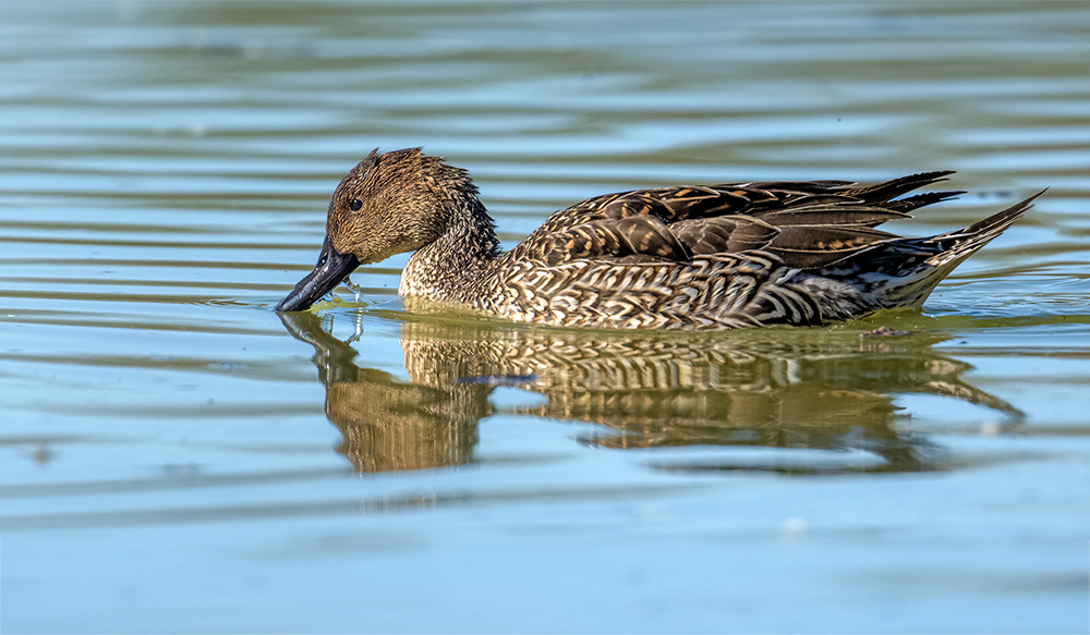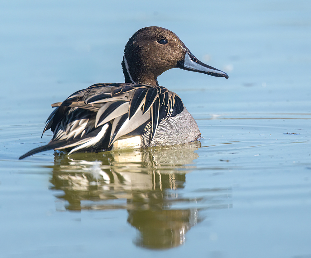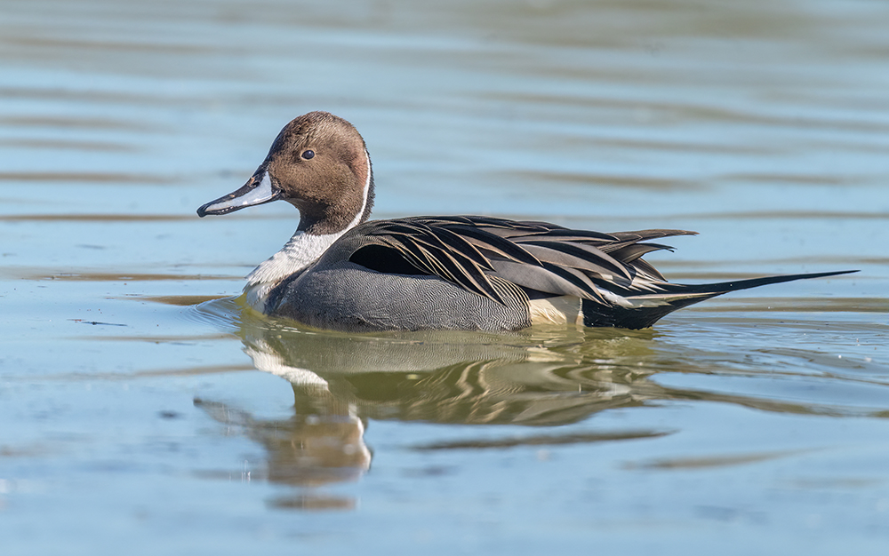 The Northern Pintail is a slender dabbling duck notable for the male’s chocolate-brown head, white breast stripe, and elongated central tail feathers, while the female is more mottled brown with a shorter pointed tail. In Arizona, pintails are principally seasonal visitors, arriving in autumn to spend the winter in shallow wetlands, marshes, lakes, and flooded agricultural fields statewide—particularly along the lower Colorado River corridor and at refuges such as Imperial NWR. They feed by dabbling for seeds, aquatic plants, and small invertebrates in open water and exposed mudflats, often forming large mixed flocks with other waterfowl. Breeding occurs well north of the state, making confirmed nestings in Arizona extremely rare, but their dependable winter presence highlights the critical role of wetland conservation and managed agricultural habitats in this arid landscape.