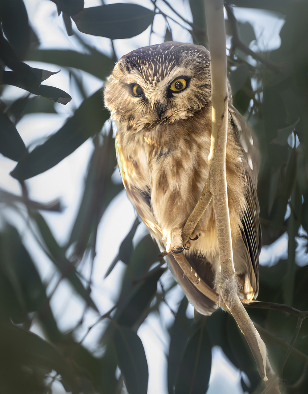 The Northern Saw-whet Owl is a small, secretive owl measuring about 7–8 inches in length with a rounded head, no ear tufts, large yellow eyes, and mottled brown and white plumage. In Arizona, it inhabits high-elevation coniferous and mixed conifer–aspen forests, especially in the state’s northern and eastern mountains, though it can also occur in the Madrean Sky Islands of the southeast. Primarily nocturnal, it roosts quietly in dense foliage by day and hunts at night for small mammals, particularly deer mice, as well as insects and small birds. The species is often more common than its elusive nature suggests, its presence more likely detected in spring when males give their repetitive, high-pitched “too-too-too” calls. Northern Saw-whet Owls nest in tree cavities, often those excavated by woodpeckers, and readily use nest boxes. While considered a year-round resident in suitable habitat in Arizona, some individuals migrate or move downslope in winter, especially in years of scarce prey.