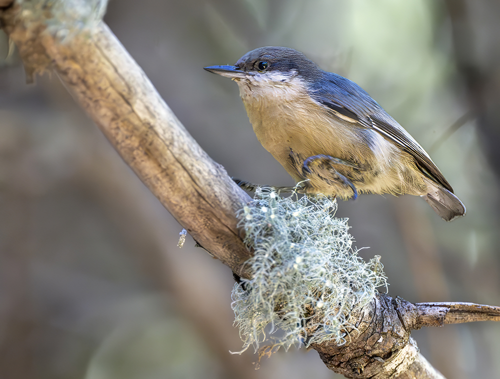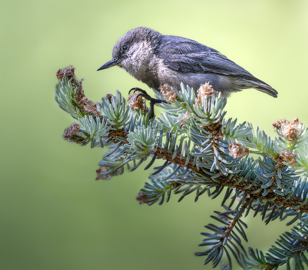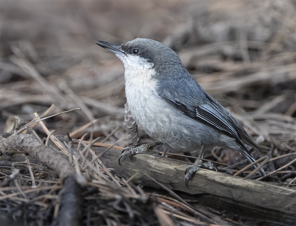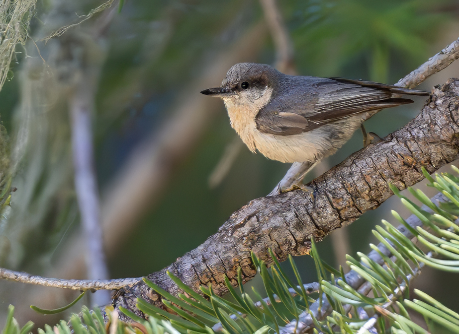 The Pygmy Nuthatch is a small, highly social songbird that inhabits the pine forests of northern and central Arizona, especially those dominated by ponderosa pine. Measuring only about 4.3 inches (11 cm) in length and weighing around 0.3 ounces (9–11 g), it is one of the tiniest nuthatches in North America. It is characterized by its brown cap, grayish back, pale underparts, and a distinctive high-pitched, squeaky call that is often heard in chattering flocks. Unlike many forest birds, the Pygmy Nuthatch is non-migratory, residing year-round in Arizona’s upland coniferous regions. It forages actively on pine trunks and branches, gleaning insects, spiders, and seeds, and is also known for its cooperative breeding behavior, with extended family groups helping to raise young. In winter, these nuthatches often roost communally in tree cavities, huddling together in large groups to conserve heat during cold mountain nights.