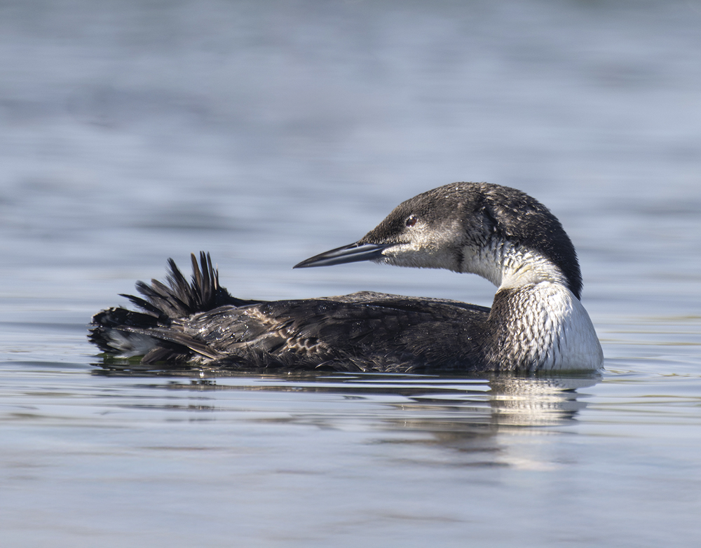 Pacific Loons are medium-sized divers, slightly smaller and sleeker than Common Loons, measuring roughly 25 inches in length with a wingspan of 36 inches. In breeding plumage they show a smooth gray head, black throat patch with subtle purple sheen, stark white underparts, and a finely checkered black-and-white back. In winter , which We see in Arizona, the throat and foreneck fade to white, the bill appears more silvery, and overall plumage is drabber. Like all loons, their legs sit far back on the body, and they carry a dagger-shaped bill suited for underwater foraging.