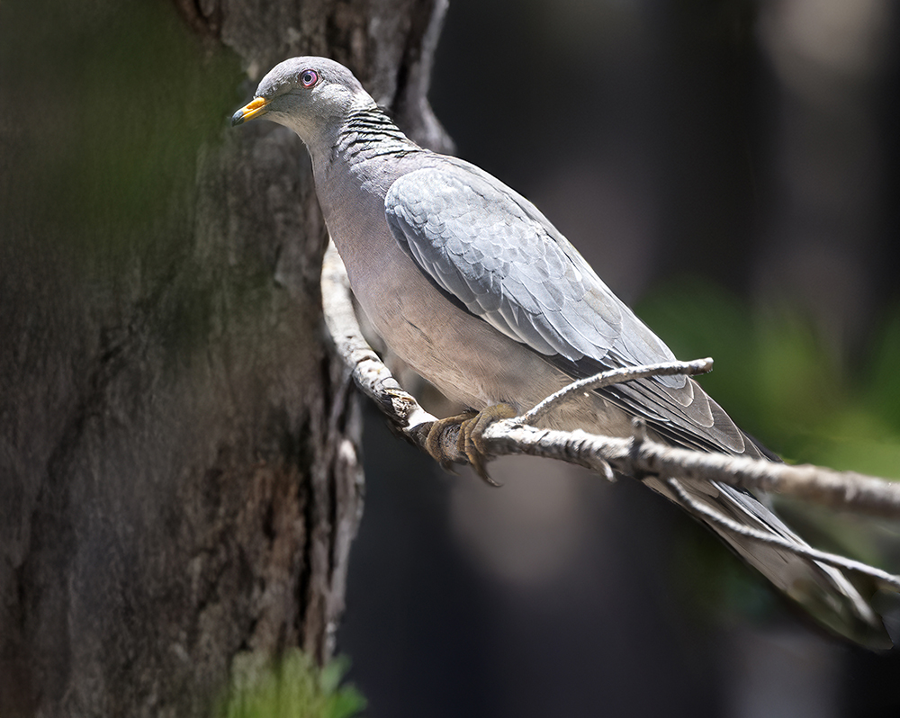 The Band-tailed Pigeon, Arizona’s only native pigeon, is a large, slate-gray bird with a distinctive white crescent on the nape and a broad, pale gray band across the tail that gives the species its name. In Arizona, it is typically found in the pine–oak woodlands and mixed conifer forests of the Sky Islands and Mogollon Rim, where it feeds primarily on acorns, berries, and other fruits, as well as seeds and occasional invertebrates. These pigeons are strong fliers and often travel in loose flocks, especially during migration or when moving between feeding and roosting sites. Though widespread in the western United States, their presence in Arizona is seasonal, with most records occurring from spring through fall, and some populations making altitudinal movements in response to food availability. Their soft, owl-like cooing calls are often heard before the birds are seen, as they can be surprisingly inconspicuous in dense canopy. While not considered threatened, Patagioenas fasciata is sensitive to habitat loss and hunting pressure, and its status in Arizona highlights the importance of conserving montane forest habitats that provide critical foraging and nesting areas.