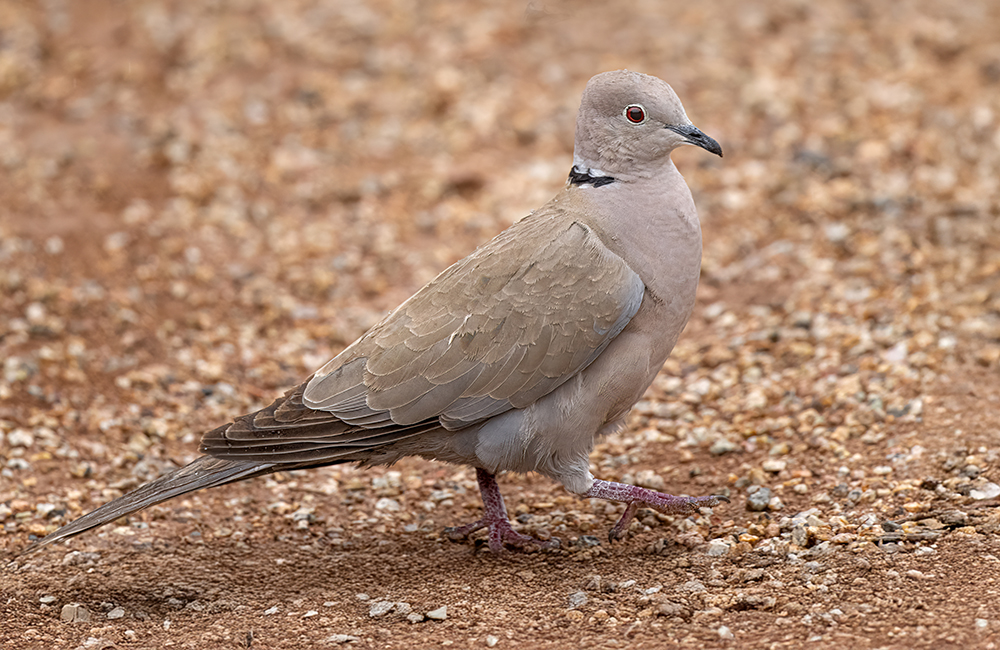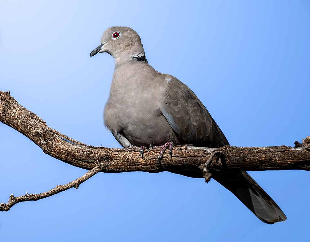 The Eurasian Collared-Dove is a medium-sized dove, about 12–14 inches long, that has become widespread in Arizona since its arrival in the state during the late 20th century. Native to southern Asia and Europe, it spread rapidly across Europe during the 20th century and then colonized North America after being introduced in the Bahamas in the 1970s. By the 1990s it was first reported in Arizona, and it is now a common urban and suburban dove in the state. Recognizable by its pale gray-tan plumage, long square-tipped tail, and distinctive narrow black collar on the back of the neck, it is often confused with the native Mourning Dove (Zenaida macroura), but the collared-dove is larger, bulkier, and lacks the long tapered tail. In Arizona, Eurasian Collared-Doves thrive in towns, farms, and residential areas where food sources such as grain and bird feeders are abundant. They are year-round residents and have adapted well to human-altered landscapes, frequently nesting on man-made structures and producing multiple broods each year. Though not native, their presence has not been shown to strongly displace native dove species, but their explosive population growth highlights how quickly an introduced species can establish itself in favorable habitats.