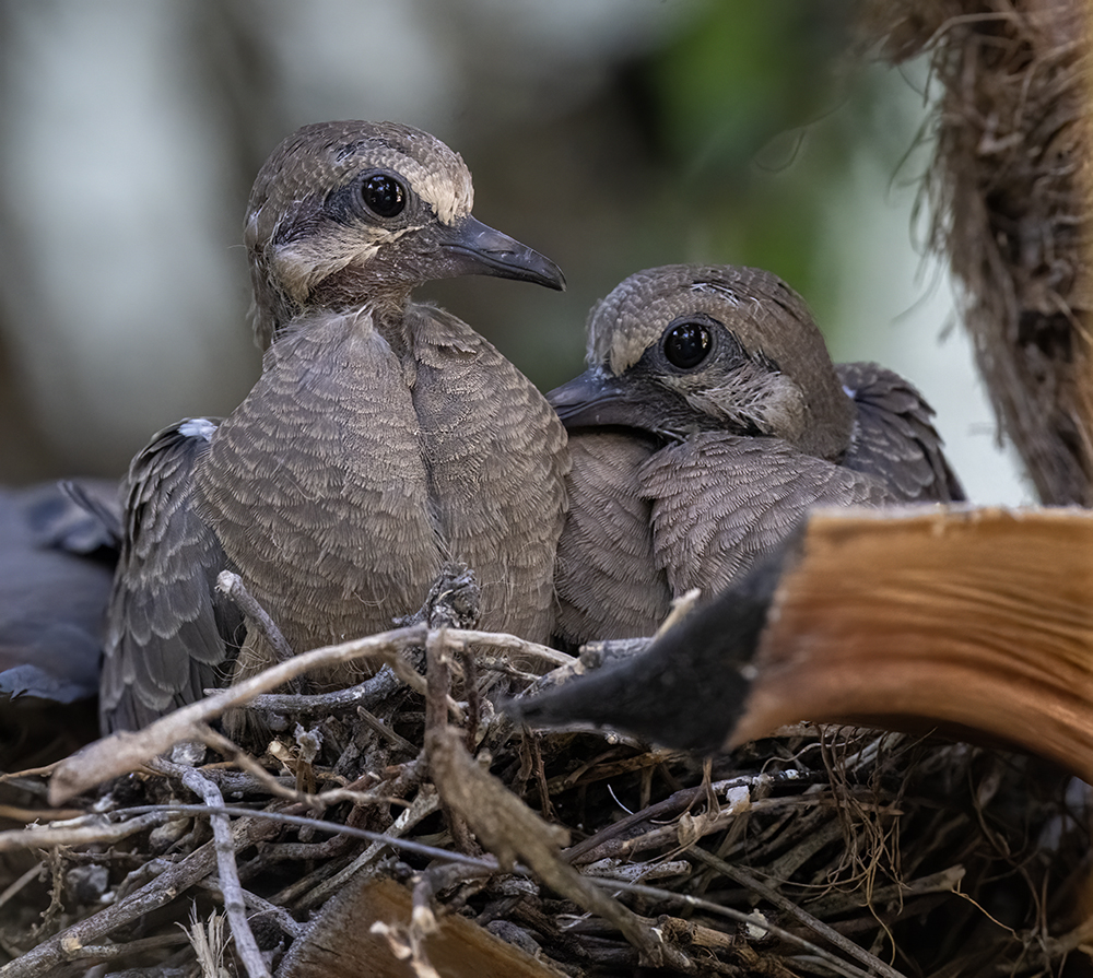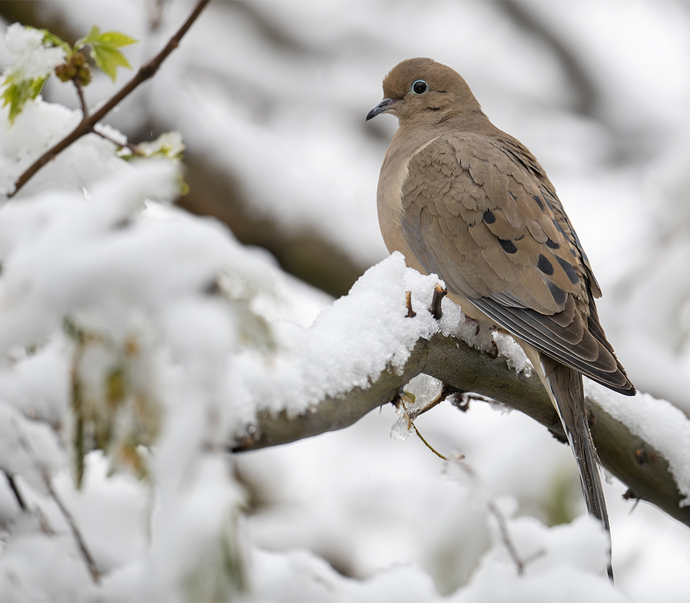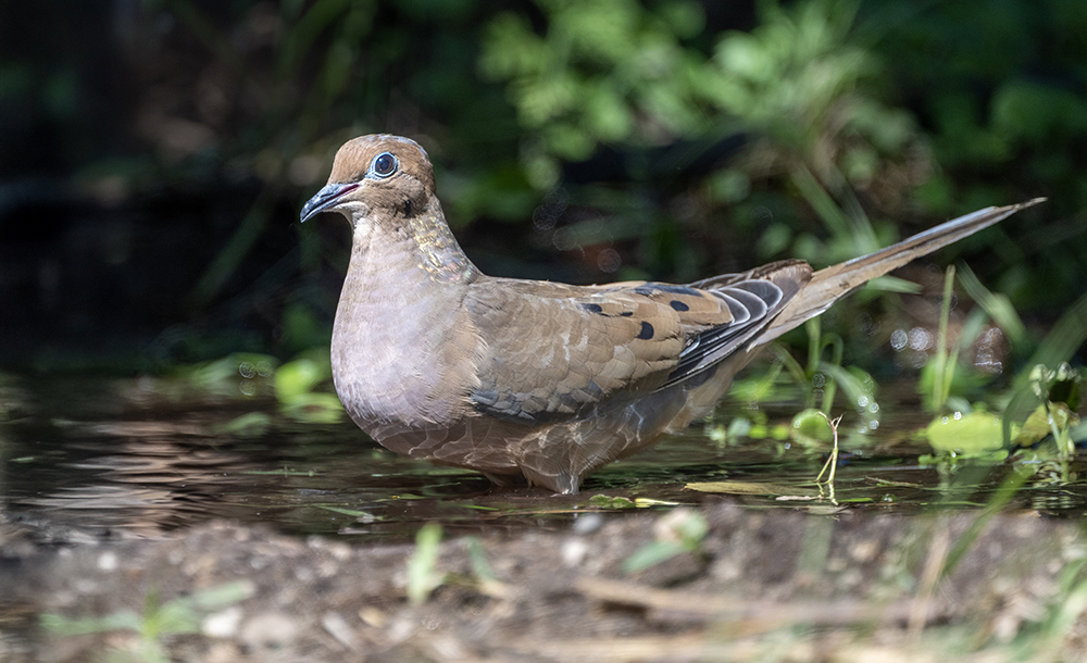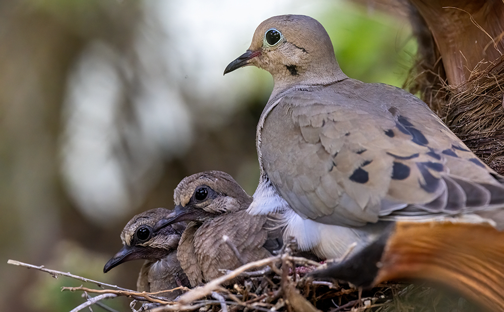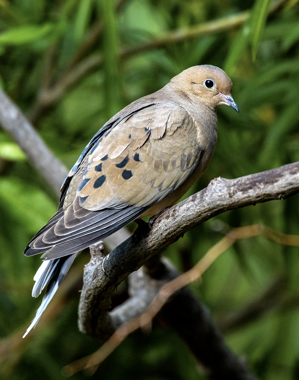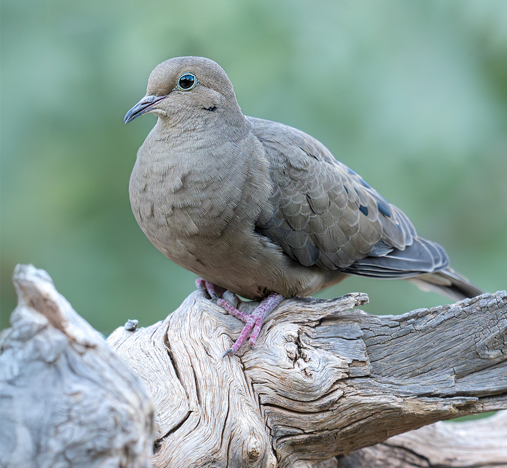 The Mourning Dove is one of the most widespread and familiar bird species in Arizona, commonly seen across deserts, grasslands, farmlands, suburban yards, and city parks. Recognizable by its soft gray-brown plumage, black spots on the wings, and long pointed tail edged with white, it is best known for its mournful, cooing call that gives the species its name. Mourning Doves are medium-sized pigeons, measuring about 9–13 inches in length with a wingspan of 17–18 inches, and weighing between 3.4–6 ounces. In Arizona, they are year-round residents, though their numbers swell in spring and summer as migrants from northern regions arrive to breed. They nest readily in a variety of habitats, often building flimsy stick nests in trees, shrubs, or even on man-made structures, and can raise multiple broods in a season thanks to their rapid reproductive cycle. Their diet consists mainly of seeds, which they forage on the ground, and they are especially attracted to agricultural fields and backyard feeders offering millet, cracked corn, or sunflower seeds.