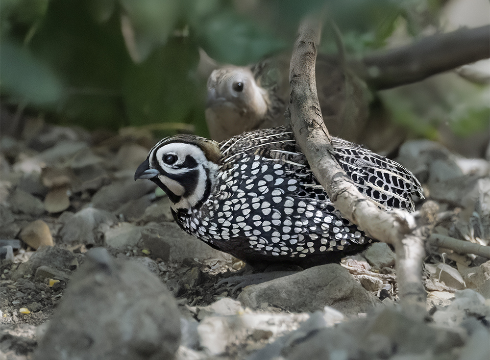 Montezuma’s Quail, sometimes called Mearns’s Quail, is a small, cryptic game bird found in southeastern Arizona, primarily in the oak–grassland foothills of the Madrean Sky Islands and along grassy canyon slopes. Recognized for its striking appearance, the male shows a bold harlequin pattern of black-and-white facial markings, a rich chestnut belly, and finely speckled flanks, while the female is more subdued in buff and brown tones that provide camouflage.