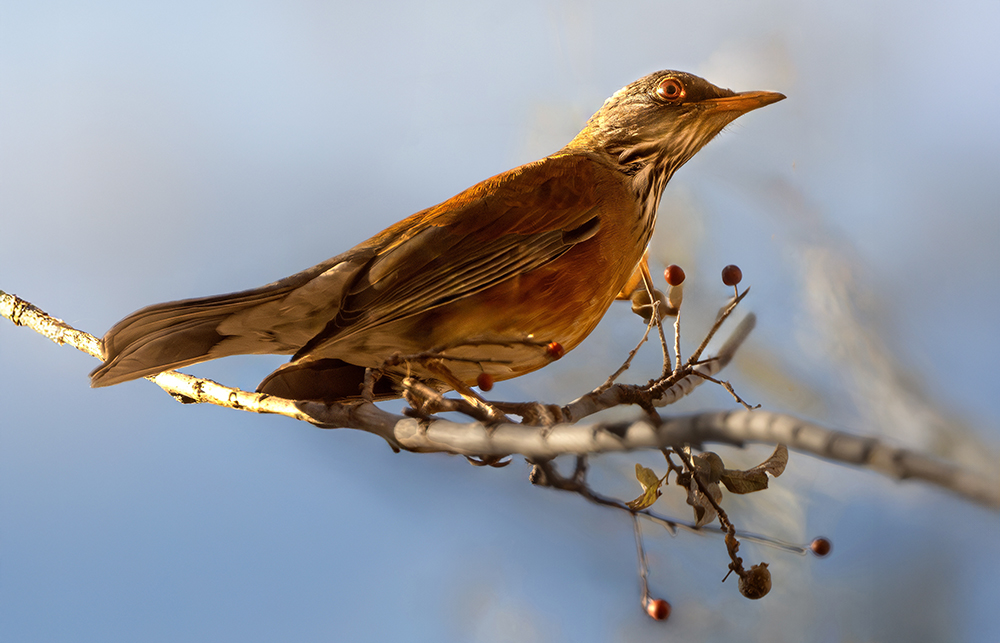 The Rufous-backed Robin is a rare visitor to Arizona, most often recorded in the southern parts of the state, especially in riparian woodlands and suburban areas near Tucson and Nogales. Native to western Mexico, this thrush occasionally wanders north across the border, where it attracts considerable attention from birders. It is larger than the American Robin (Turdus migratorius), with a distinctive rufous back and flanks contrasting with a grayish head and white underparts. Records in Arizona are sporadic, usually during fall and winter, and the species is considered a casual but regular vagrant.