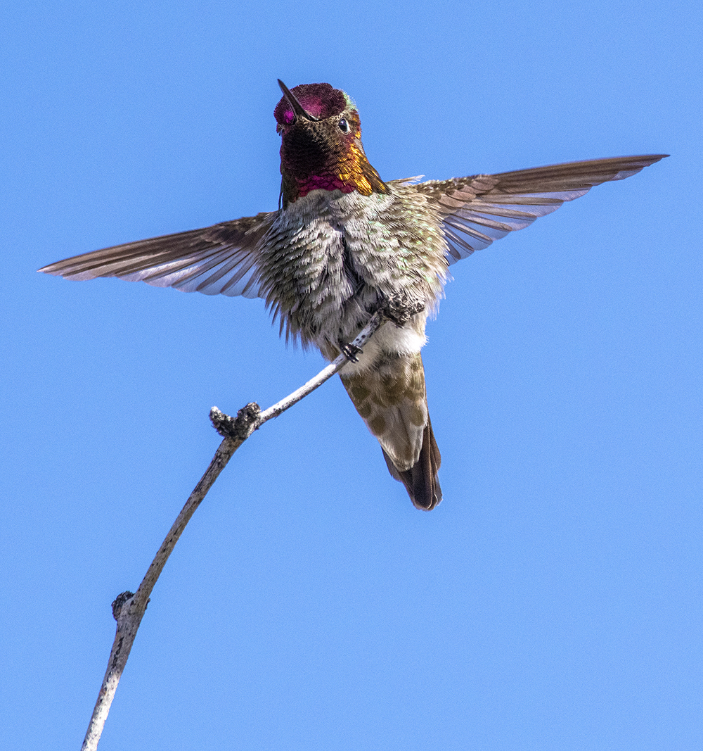 Anna’s Hummingbirds are regular visitors to Tucson hummingbird feeders; they are mostly green and gray. The male's head and throat are covered in iridescent reddish-pink feathers that can look dull brown or gray without direct sunlight. The iridescent throat patch of male hummingbirds is called a gorget. The Anna’s gorget extends over its head, making it more of a balaclava than a bib. Oddly, female Anna’s have a tiny red gorget—females of most species have none.