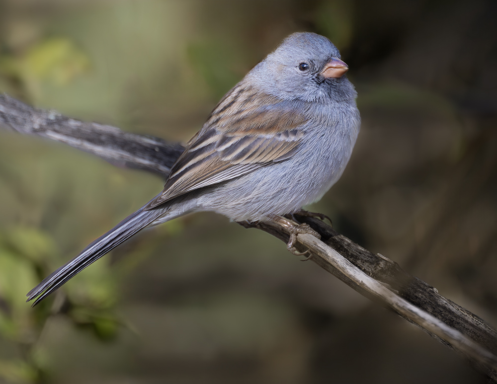 The Black-chinned Sparrow is a distinctive desert sparrow found in Arizona, where it inhabits arid foothills, chaparral, and desert scrub with scattered yucca, agave, and mesquite. Males are easily recognized during the breeding season by their crisp gray body, dark bill, and striking black throat and chin patch, which contrast with the white belly. Females and immatures are plainer, with gray-brown tones and only faint dark markings. This species breeds locally in central and southeastern Arizona, particularly in rocky uplands and the lower slopes of mountain ranges, where its clear, musical song carries over the sparse vegetation. In winter, most individuals migrate southward into Mexico, leaving only scattered records in Arizona outside the breeding season. The Black-chinned Sparrow’s reliance on desert and chaparral habitats makes it vulnerable to habitat loss and degradation.