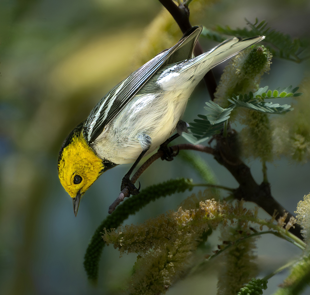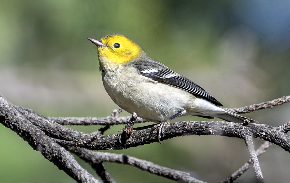 The Hermit Warbler is a rare migrant and occasional breeder in Arizona’s highest pine forests. Males have bright yellow heads and contrasting gray backs with black throats. They favor cool, mature forests with heavy canopy cover. Hermit Warblers are often confused with Townsend’s where their ranges overlap, and hybrids occasionally occur. During migration, they pass through mountain canyons and foothill woodlands, foraging among the treetops for insects.
