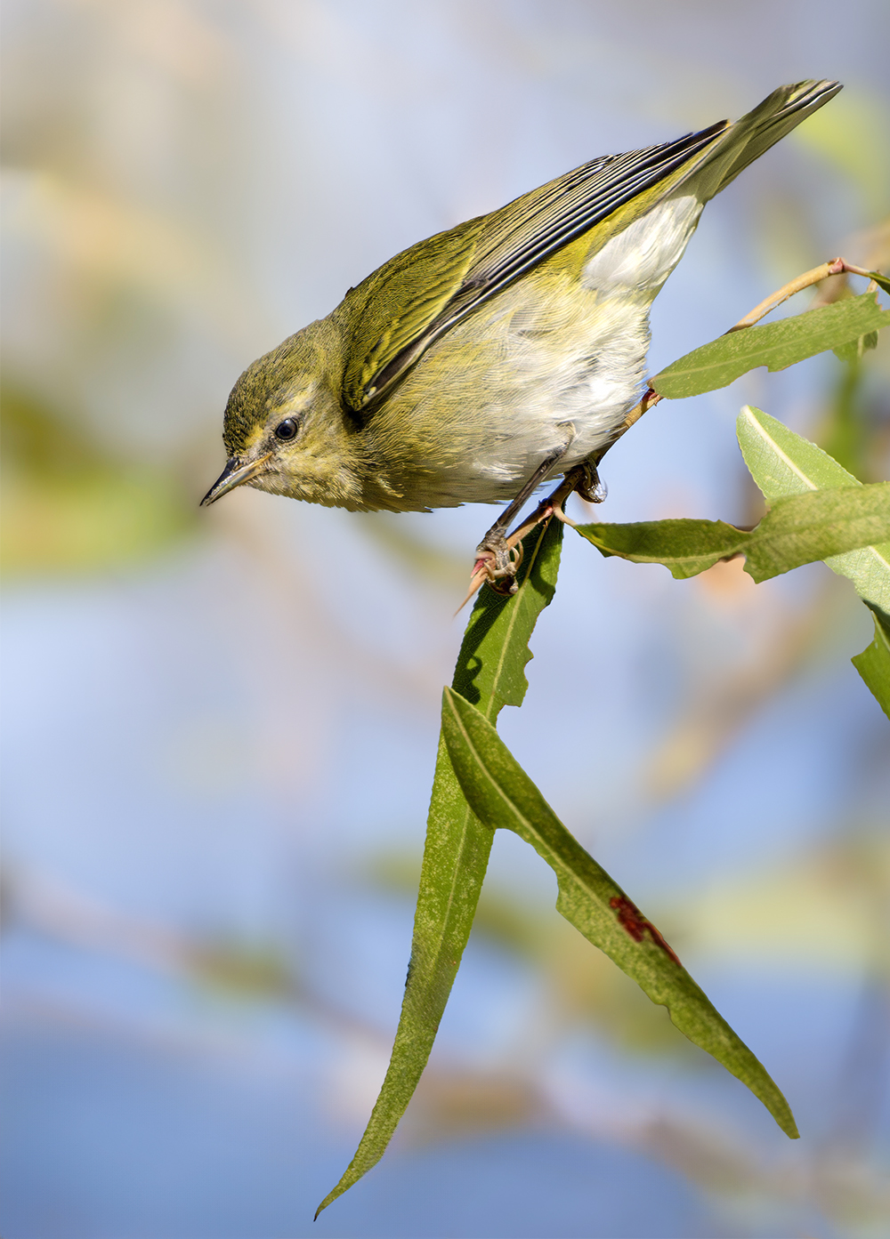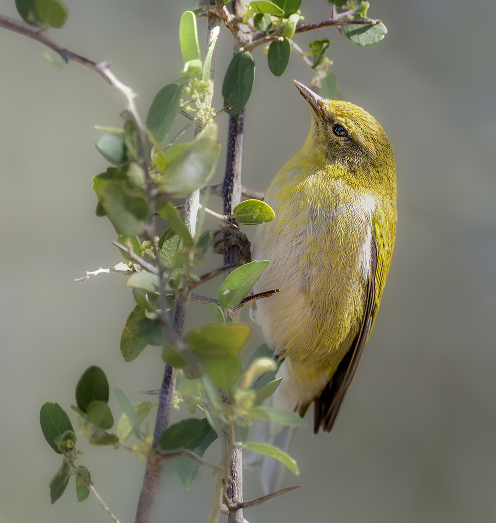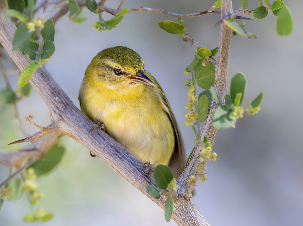 The Nashville Warbler passes through Arizona during migration, particularly in spring. It is a bright, active bird with a gray head, white eye ring, and yellow underparts. Breeding farther north, it favors birch and aspen forests, but in Arizona it stops over in oak-pine foothills and riparian groves. Its flight is quick and direct, and its sweet, ringing song can be heard as it forages among low branches. Though brief in its visits, the Nashville Warbler is one of the most colorful and noticeable migrants each spring.