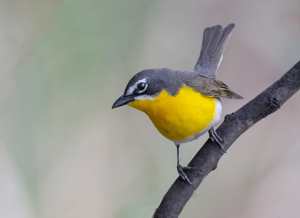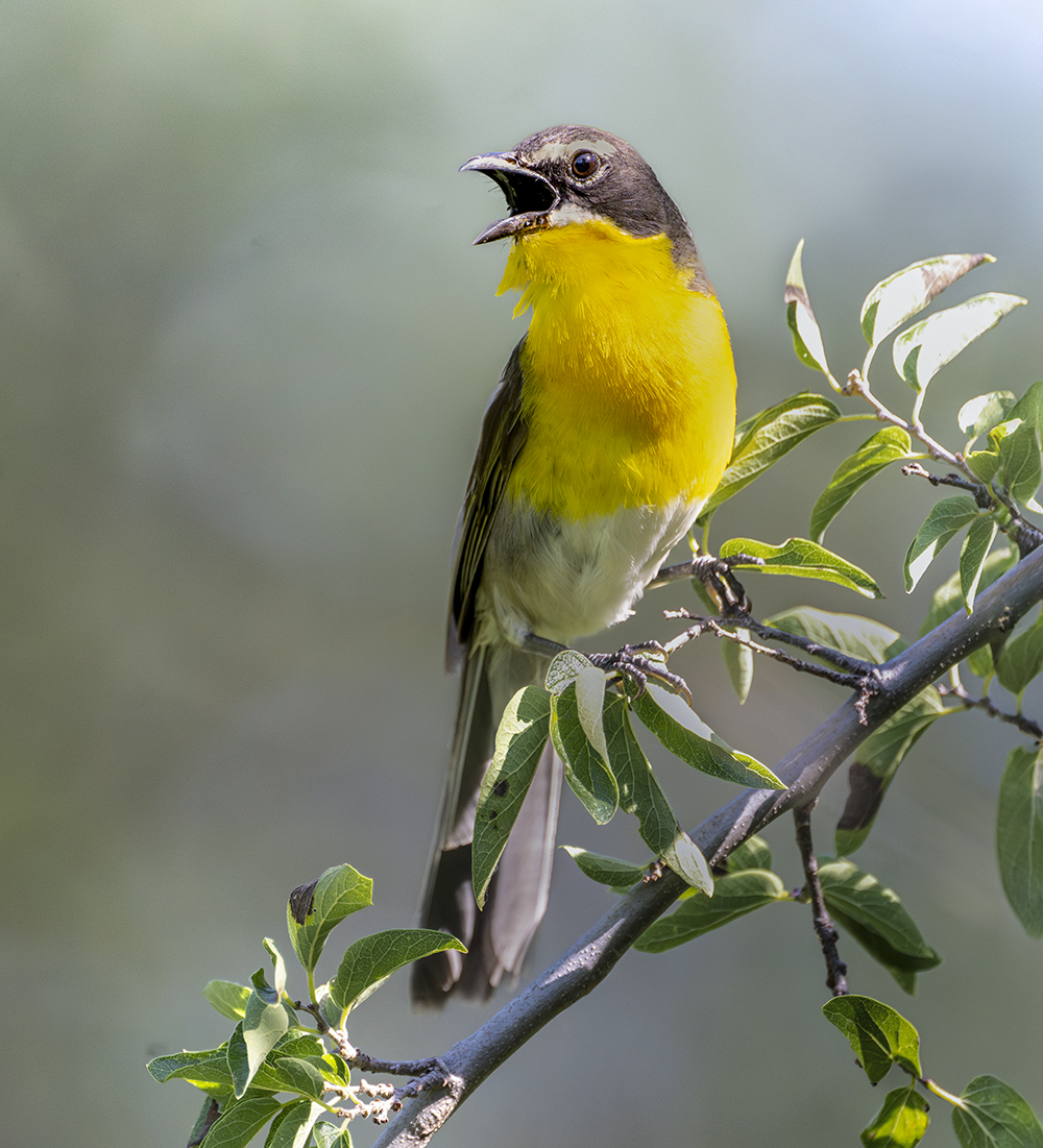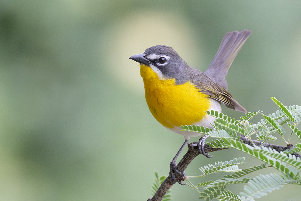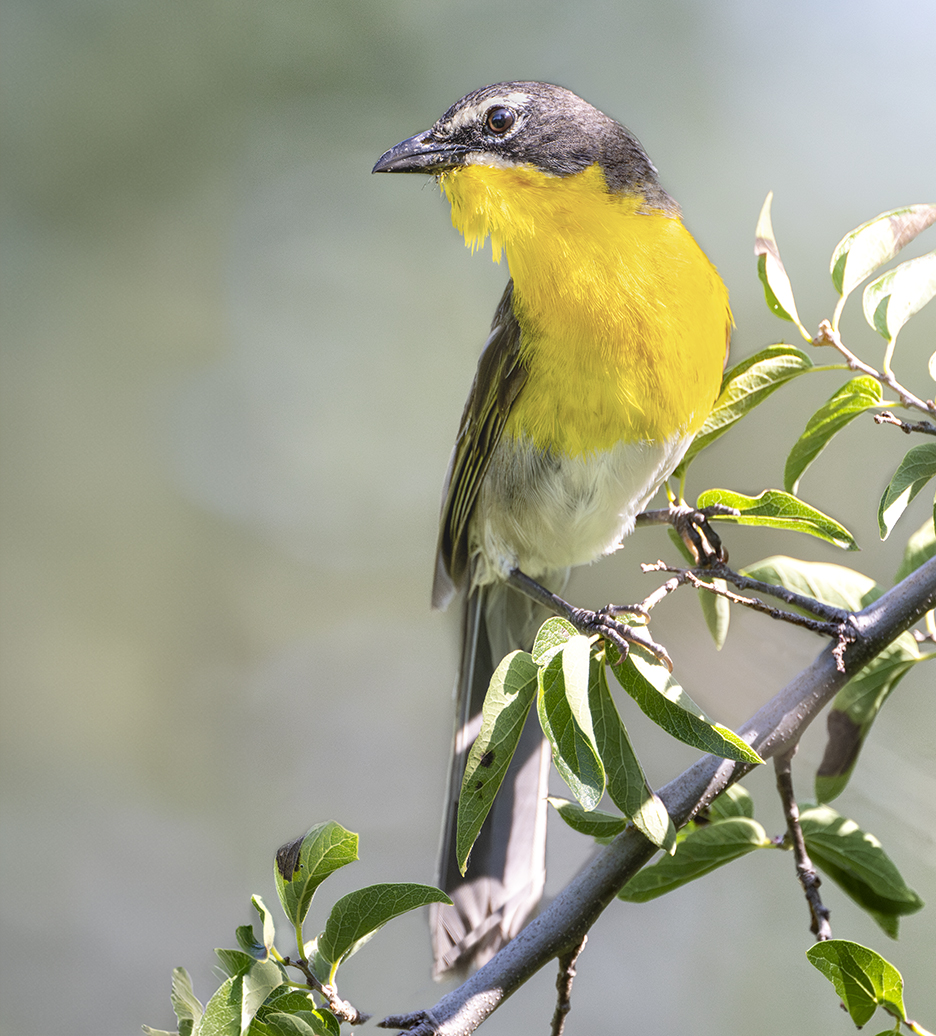 The Yellow-breasted Chat, once considered a warbler but now in its own family, is the largest and most vocal of them all. Its bright yellow breast, olive-green back, and long tail are complemented by a loud, varied song of whistles, croaks, and chuckles. In Arizona, chats breed in dense riparian thickets and desert washes, where they are often heard long before being seen. They migrate south in fall to winter in Mexico, returning each spring to announce their presence with exuberant singing from deep cover.