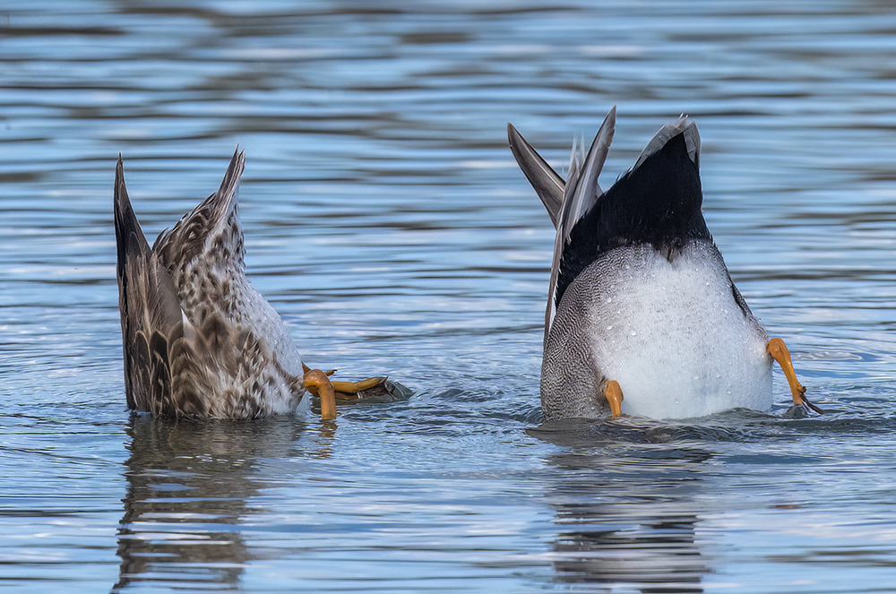 Dabbling ducks (tribe Anatini) are surface-feeding waterfowl that capture food by tipping forward—often upending—with their tails in the air to reach aquatic vegetation, seeds, and small invertebrates just below the water’s surface. In Arizona, they are among the most numerous waterfowl, especially during fall and winter migration.
