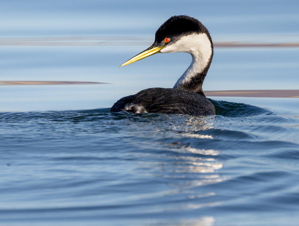 Western Grebe is the largest North American grebe, measuring 25 inches in length with a wingspan of 24 inches and weighing 1138–1826 g. Adults display striking black-and-white plumage with a sharply demarcated black cap, white cheeks, a slender swan-like neck, yellowish-green bill, and piercing red eyes.