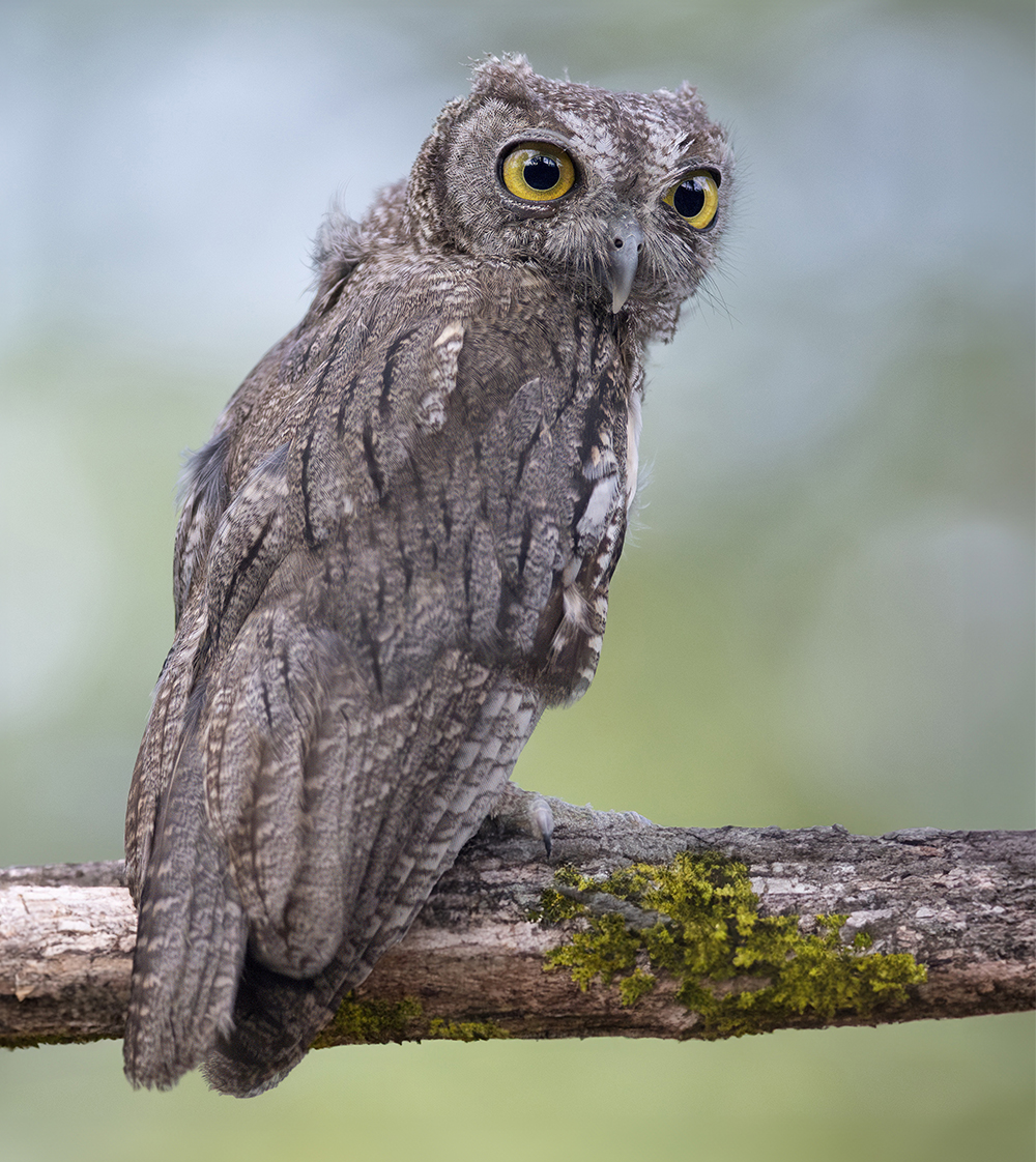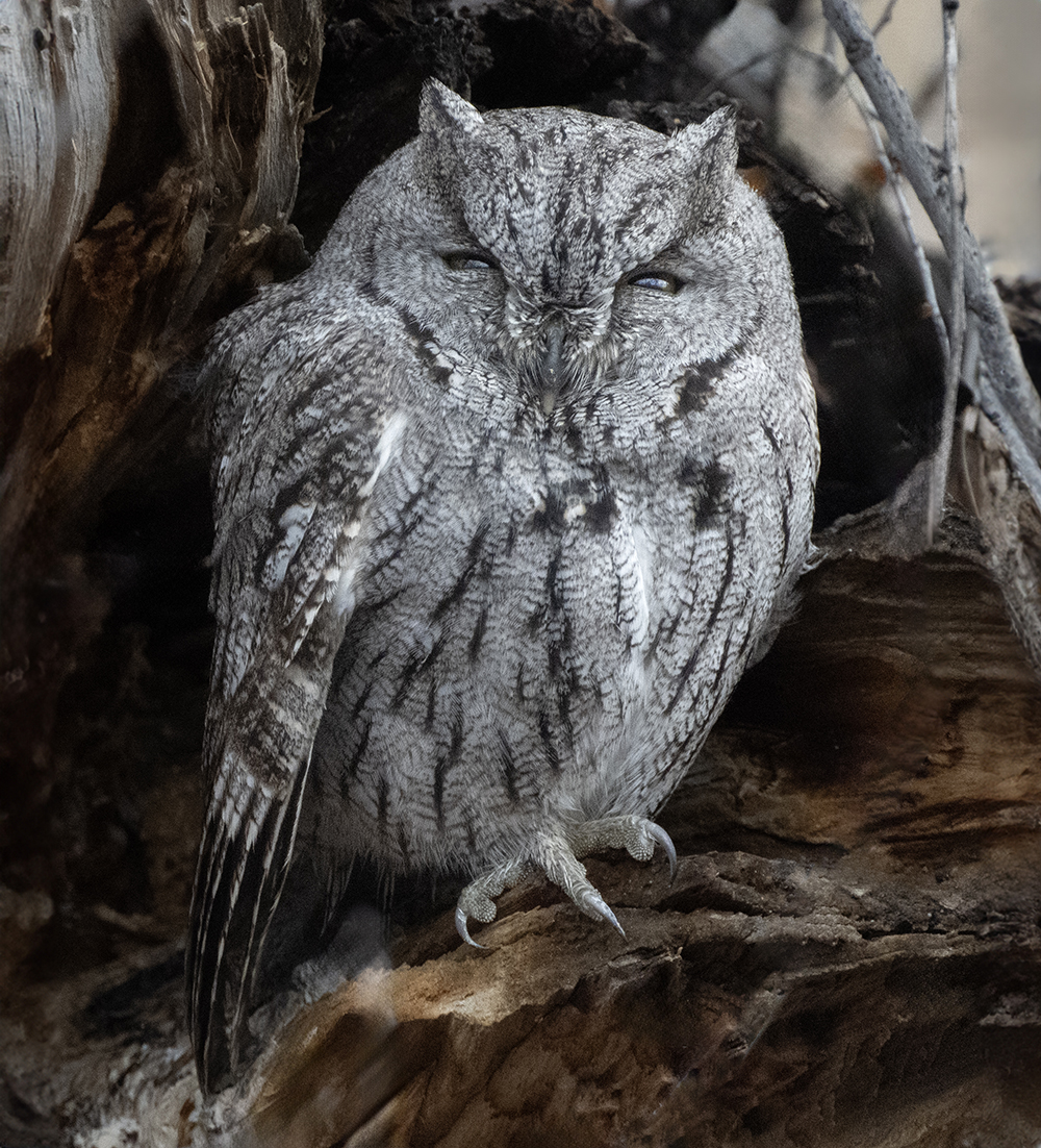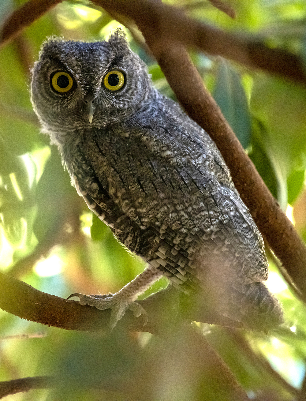 The Western Screech-Owl (Megascops kennicottii) is a small, nocturnal raptor found year-round across much of Arizona, from desert washes and riparian woodlands to foothill canyons and suburban neighborhoods with mature trees. Measuring about 7.5–10 inches in length, it has gray or brown plumage mottled with streaks and bars, short ear tufts, and striking yellow eyes, allowing it to blend seamlessly into tree bark during the day. These owls are primarily cavity nesters, using natural holes or abandoned woodpecker cavities, and readily accept nest boxes. Their diet is varied and opportunistic, including insects, small mammals, birds, reptiles, and amphibians, and they typically hunt from low perches at night. In Arizona, their distinctive series of accelerating whistles—often described as a bouncing ball call—can be heard throughout the year, with peak vocal activity during the breeding season from February to May. Resident and non-migratory, Western Screech-Owls are well adapted to both wild and human-altered landscapes, though they depend on suitable tree cover and nesting sites for survival.