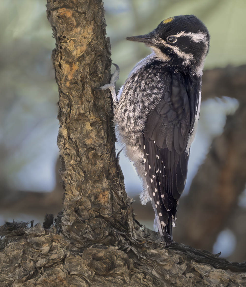 The American Three-toed Woodpecker is an uncommon but regular resident in Arizona, primarily restricted to high-elevation coniferous forests of the White Mountains, San Francisco Peaks, and other northern ranges. Measuring about 8–9 inches long, this species is distinguished by its barred black-and-white back, white underparts with fine barring, and the absence of the outer toe, which gives it its name. Males show a distinctive yellow crown patch. Unlike many woodpeckers, it lacks red on the head and often works methodically along burned or beetle-killed trees, prying away bark to feed on wood-boring beetle larvae. In Arizona, its presence is often linked to recent forest fires, as it thrives in post-burn habitats with abundant insect prey. The species is considered rare and localized in the state, with records concentrated in suitable high-elevation spruce-fir and mixed conifer habitats. Although generally secretive and quiet, its tapping and subtle calls may betray its presence to careful observers.