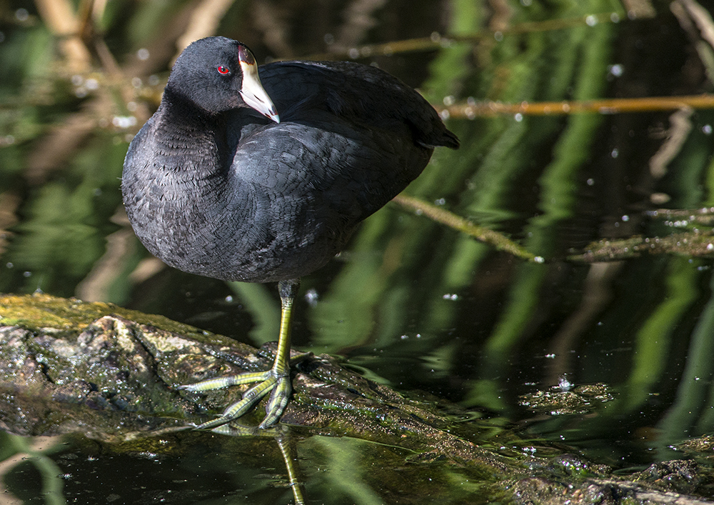 American Coots are plump, slate-gray waterbirds distinguished by a short, thick white bill and greenish, lobed toes rather than webbed feet. In Arizona, they are abundant winter visitors on virtually all freshwater lakes, reservoirs, and marshes—often gathering in rafts of hundreds to thousands from November through March. As spring advances, most birds depart northward, but a small number remain to breed in high-elevation wetlands along the Mogollon Rim and other mountain marshes, where pairs build floating nests among emergent vegetation and lay 8–12 eggs per clutch (Wikipedia, Audubon). American Coots forage by diving or dabbling for aquatic vegetation—especially algae and pondweeds—and will also take invertebrates, mollusks, and small fish when available, making them versatile feeders and a familiar sight to Arizona birders year-round.