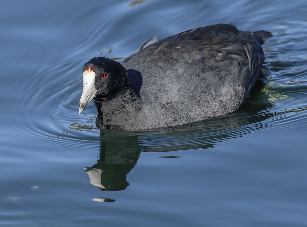 American Coots are plump, slate-gray waterbirds distinguished by a short, thick white bill and greenish, lobed toes rather than webbed feet. In Arizona, they are abundant winter visitors on virtually all freshwater lakes, reservoirs, and marshes—often gathering in rafts of hundreds to thousands from November through March. As spring advances, most birds depart northward, but a small number remain to breed in high-elevation wetlands along the Mogollon Rim and other mountain marshes, where pairs build floating nests among emergent vegetation and lay 8–12 eggs per clutch (Wikipedia, Audubon). American Coots forage by diving or dabbling for aquatic vegetation—especially algae and pondweeds—and will also take invertebrates, mollusks, and small fish when available, making them versatile feeders and a familiar sight to Arizona birders year-round.