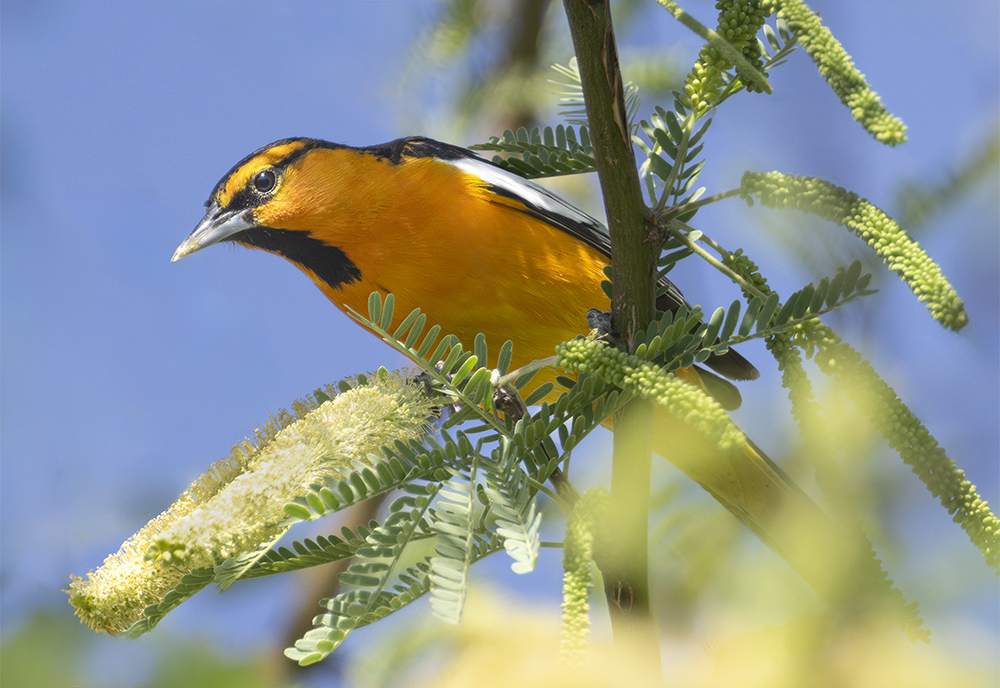 In Arizona, Bullock’s Orioles arrive in spring, usually March to April, and breed widely across lowland and mid-elevation habitats before departing in late summer for wintering grounds in Mexico. Their diet includes nectar, fruit, and insects, making them frequent visitors to hummingbird feeders and orange halves set out by bird enthusiasts. The species was once considered a single form with the eastern Baltimore Oriole (Icterus galbula), collectively known as the “Northern Oriole,” but is now recognized as distinct based on differences in plumage, voice, and genetics.