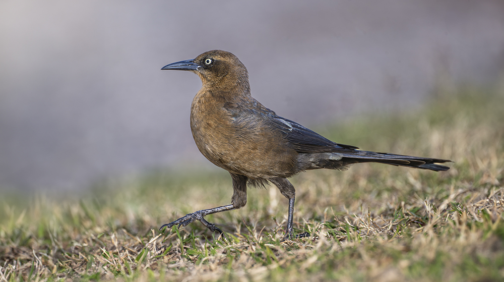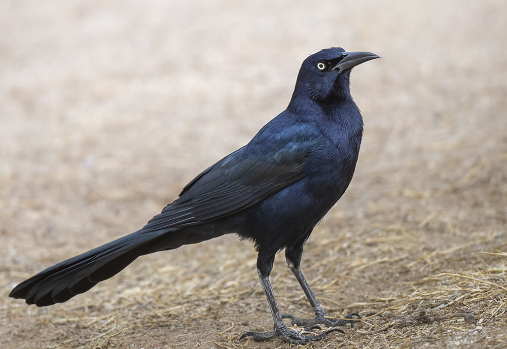 The Great-tailed Grackle is a large, highly adaptable blackbird that has become one of the most conspicuous urban and agricultural birds in Arizona. Males are striking, measuring about 16–18 inches (41–46 cm) with iridescent black plumage that shimmers purple, blue, and green in the light, a large wedge-shaped tail, and piercing yellow eyes. Females are smaller, about 13 inches (33 cm), with brown plumage, darker wings and tail, and a more slender build.