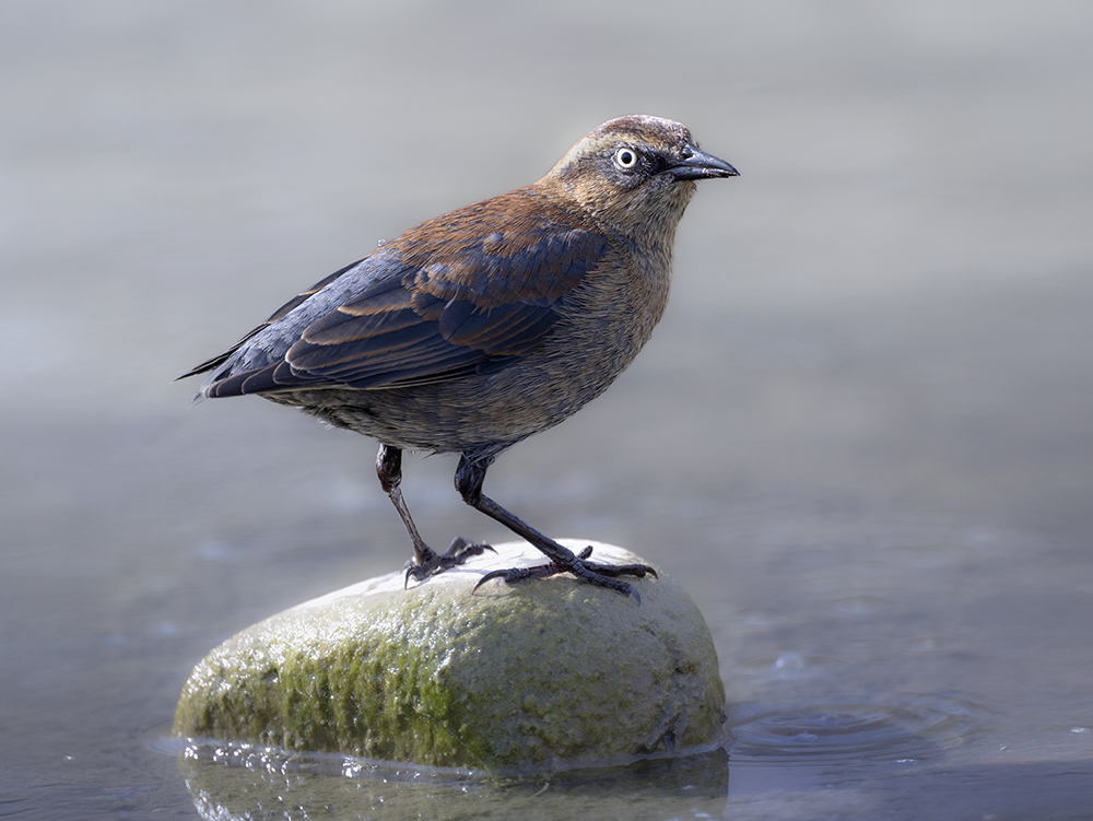 The Rusty Blackbird is one of the least common blackbirds to appear in Arizona. This medium-sized icterid, measuring about 8.5–9.8 inches long and weighing 1.7–2.8 ounces, is native to boreal forests of Canada and Alaska, where it breeds in bogs and wet woodlands. In Arizona it is considered a rare winter visitor and migrant, typically reported in small numbers at wetlands, ponds, and riparian habitats in the southeastern part of the state, including places such as El Rio Preserve in Marana and along the San Pedro River. Males in breeding plumage are glossy black with a greenish sheen, while in winter both sexes are duller brownish-black, with females showing more grayish brown tones and a pale eyebrow. Their foraging behavior often involves flipping over leaves in shallow water or mud to feed on aquatic insects, invertebrates, and seeds. Though never abundant in Arizona, confirmed records extend back decades, reflecting both the species’ wide but sparse wintering distribution and its ongoing long-term population decline, which has been estimated at more than 80% in recent decades. Sightings in the state are of particular interest to birders given the Rusty Blackbird’s status as one of North America’s fastest-declining songbirds. The one in the photograph below has lost its tail.