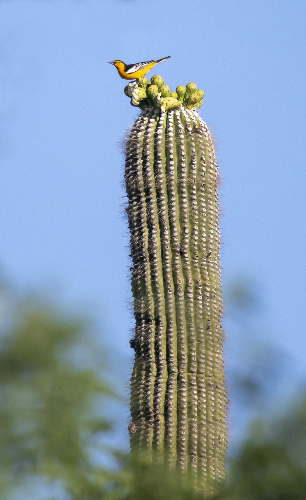 We have many Hooded Orioles visit our yard but this is the first and only time I have seen a Bullock's Oriole, so I have included this, not so good, photo (it was far away) until I get a better one. Adult males are bright orange with a black back and large white wing patch. The face is orange with a black line through the eye and a black throat.