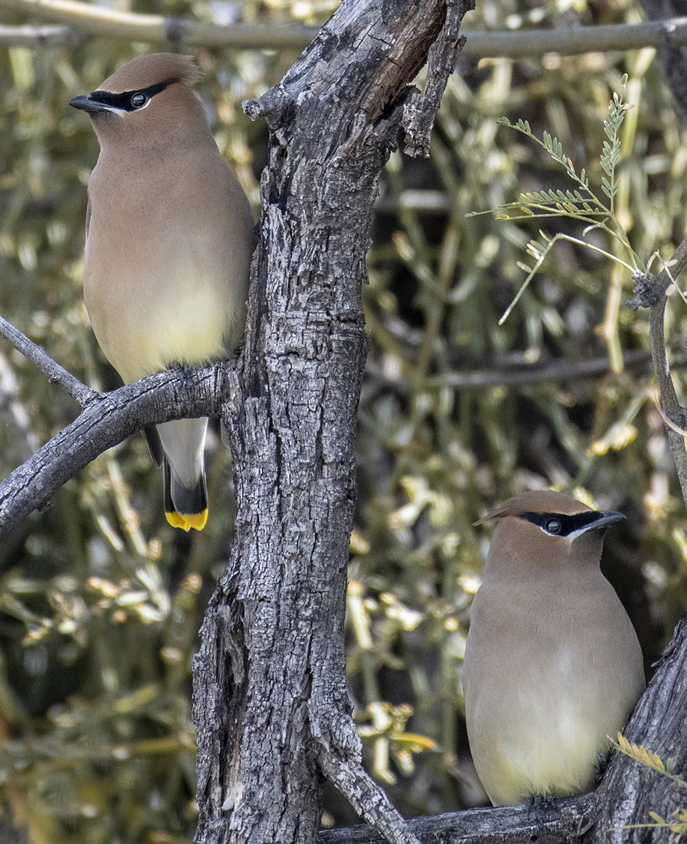 These beautiful birds are one of my favorites. They are social birds and i was lucky to see a flock of them at Sabino feasting on mistletoe berries. Cedar Waxwings are pale brown on the head and chest fading to soft gray on the wings. The belly is pale yellow, and the tail is gray with a bright yellow tip. The face has a narrow black mask neatly outlined in white. The red waxy tips to the wing feathers are not always easy to see.