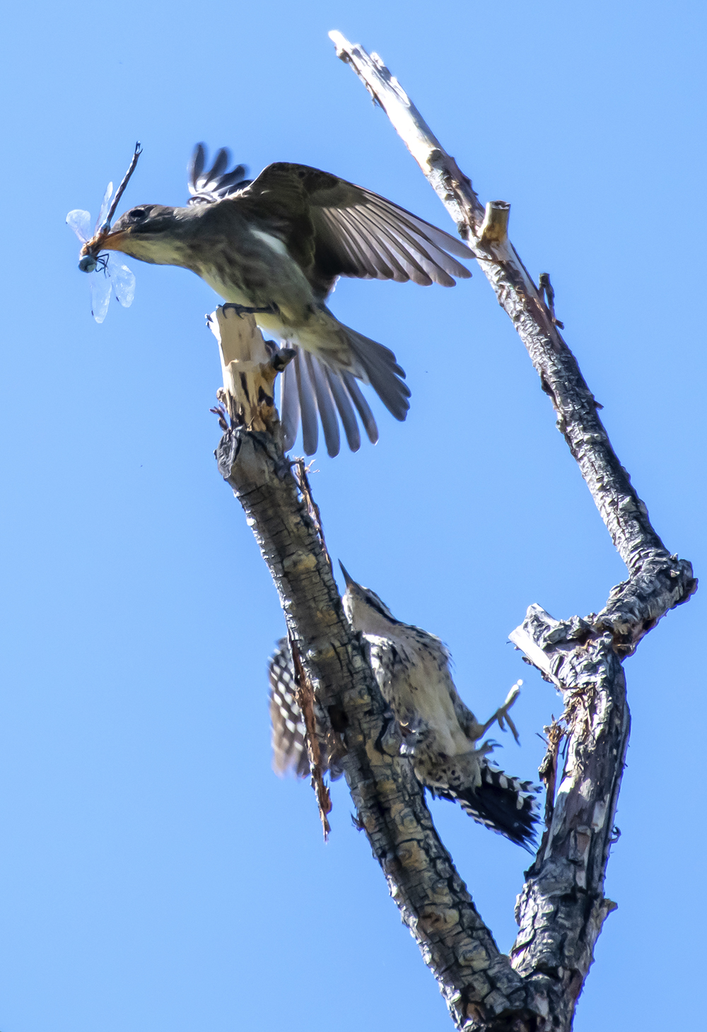 I'm not at all sure if I have identified this flycatcher correctly as it's not such a good photograph but I have included it because of the action. The Flycatcher was trying to protect the dragonfly from the Cactus Wren. The flycatcher flew away with its prize pursued by the hungry wren.
