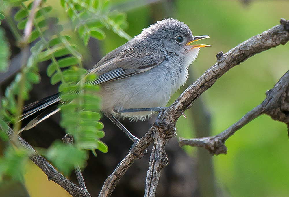 Blue-gray Gnatcatchers are tiny, slim songbirds with long legs; a long tail; and a thin, straight bill. They are pale blue-gray birds with grayish-white underparts and a mostly black tail with white edges. The underside of the tail is mostly white. The face is highlighted by a thin but obvious white eyering. They rarely slow down, fluttering after small insects among shrubs and trees with tails cocked.