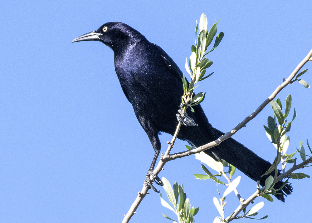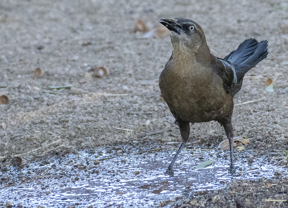 A big, brash blackbird, the male Great-tailed Grackle shimmers in iridescent black and purple, and trails a tail that will make you look twice. The rich brown females (bottom photo) are about half the male’s size.