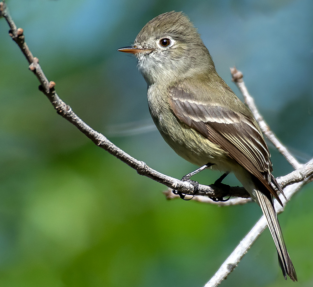 A tiny and delicately built songbird with a very short, pointed bill, comparatively long, pointed wings. Greenish-olive above with a grayish head and pale eyering.
