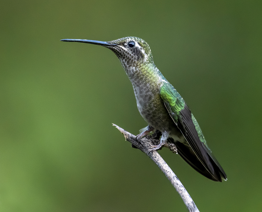 A Rivoli's is easy to ID as it is a large hummingbird, probably the largest you'll see in Arizona at 4.5-5.5 in (11-14 cm) long. Despite their size, they are not aggressive to other hummingbirds at feeders. This female is beautiful, but not as beautiful as the male, which has a magnificent purple crown when the light catches it right. I am still waiting to get a good photograph of a male!