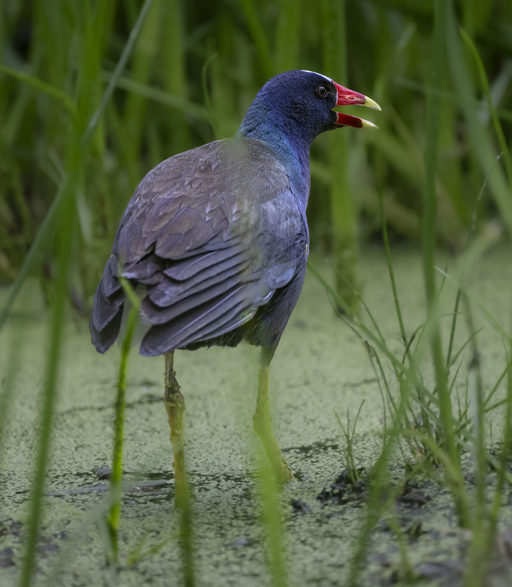 Purple Gallinules are rare visitors to Arizona, occasionally appearing in marshy habitats during migration, where their vivid plumage and bright red-and-yellow bills make them stand out against the reeds.